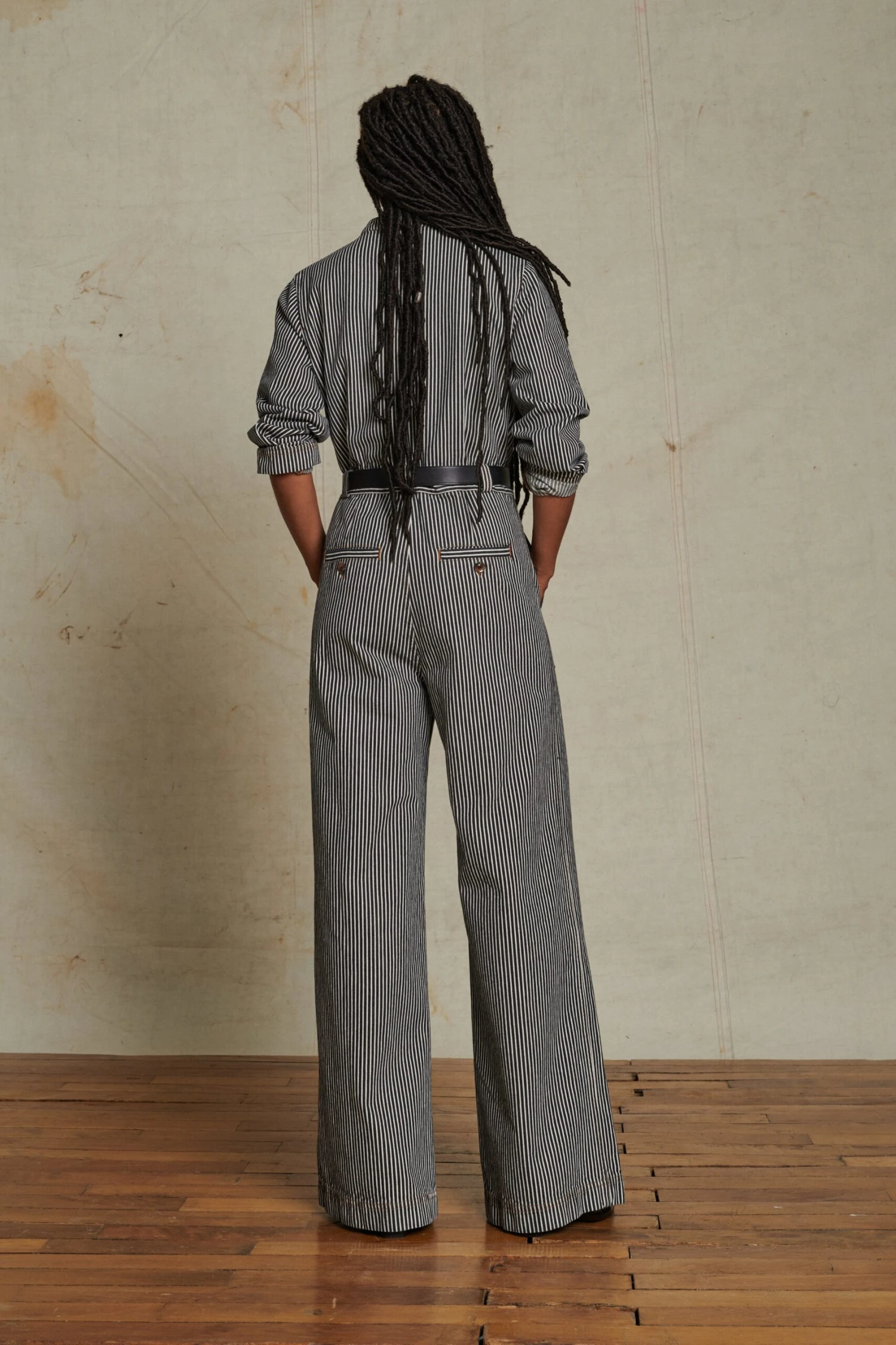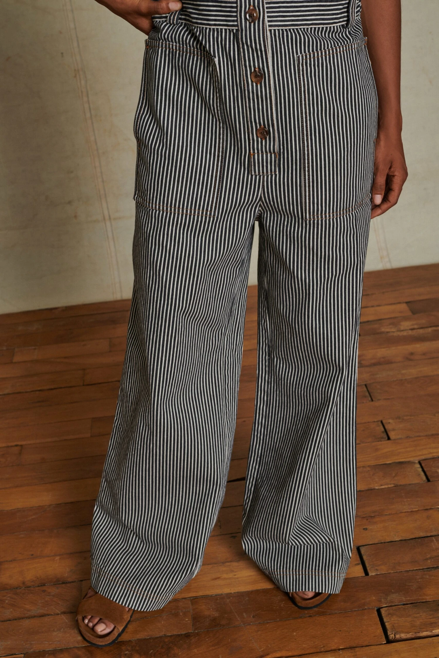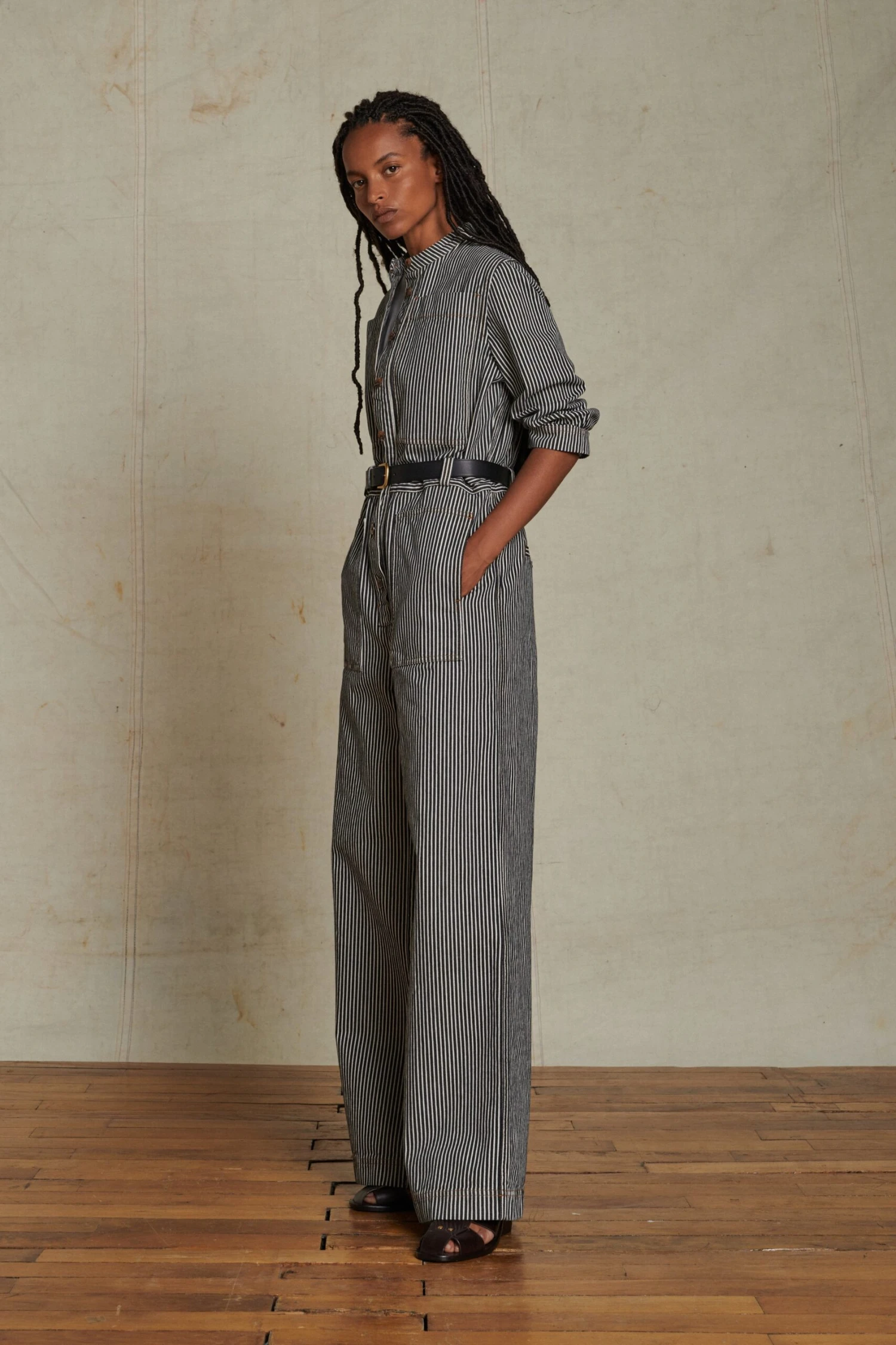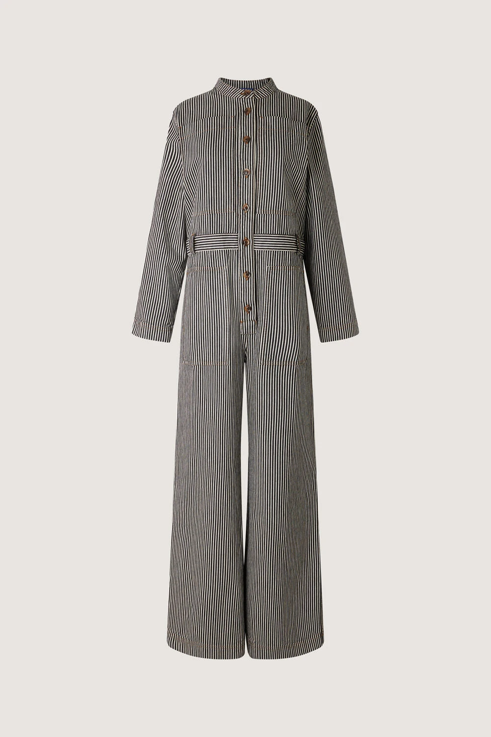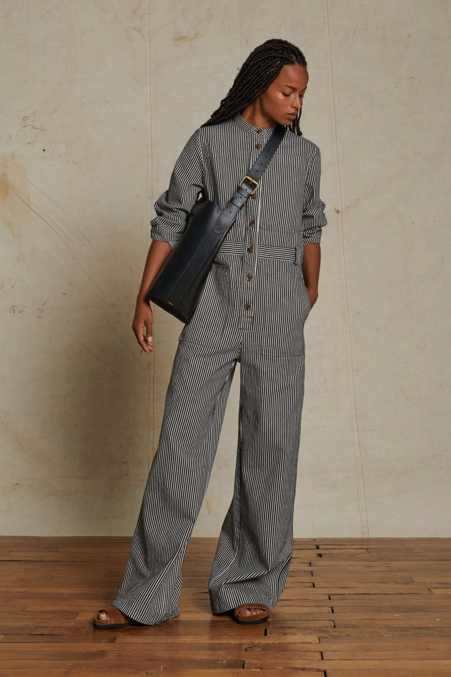 AKARI est une combinaison-pantalon en toile de denim épaisse. Sa taille haute ajustée contraste avec sa jambe large évasée, signant une silhouette 70s. Cette ligne rayée est signée de la griffe « Soeur Womenswear » qui ajoute à son allure workwear et décontractée.