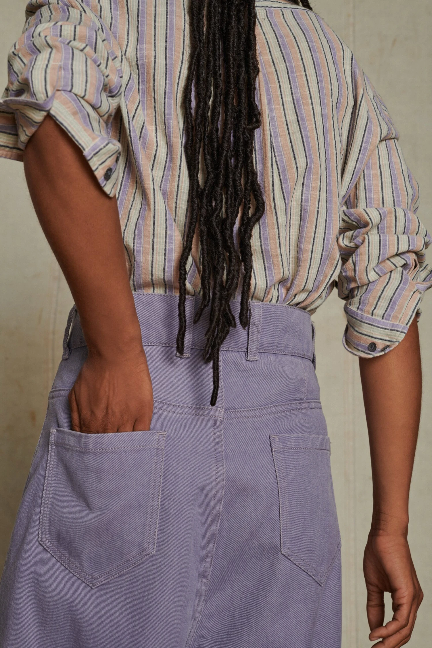 ALEXIS est un jean en toile de denim souple. Sa coupe décontractée, sa fourche basse et sa jambe longue et évasée évoquent les pantalons « baggy ». Son coloris pastel est frais et facile à associer.