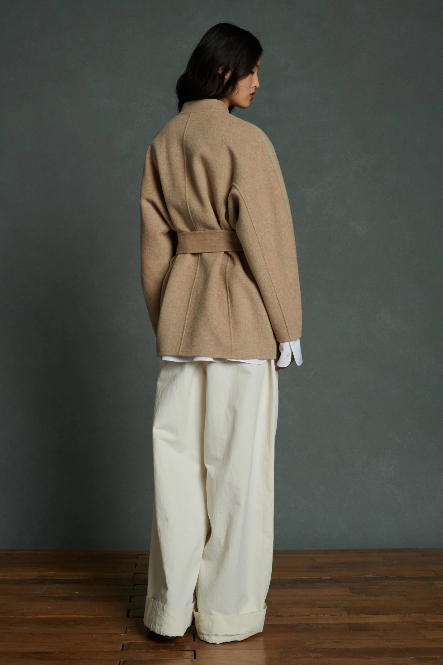 PRUSSE est un manteau à ceinturer en lainage chaud non doublé. Il présente de nombreux détails : finitions gansées qui soulignent les empiècements et les manches coudées, pied de col montant, poches insérées aux côtés, deux pattes de boutonnage (boutons nacrés dissimulés et pressions en métal brossé).