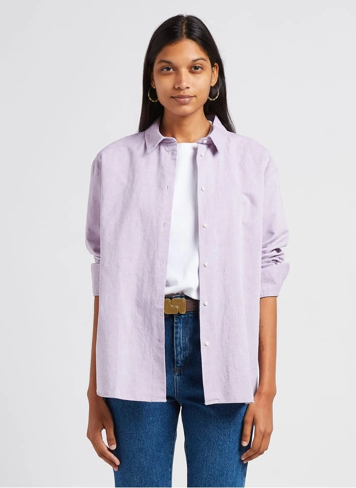 Ce modèle est présenté avec Chemise oversize en coton et lin by BELLEROSE, Tee-shirt col rond brodé La flemme en coton bio by MAISON LABICHE, Jean flare en coton by SOEUR