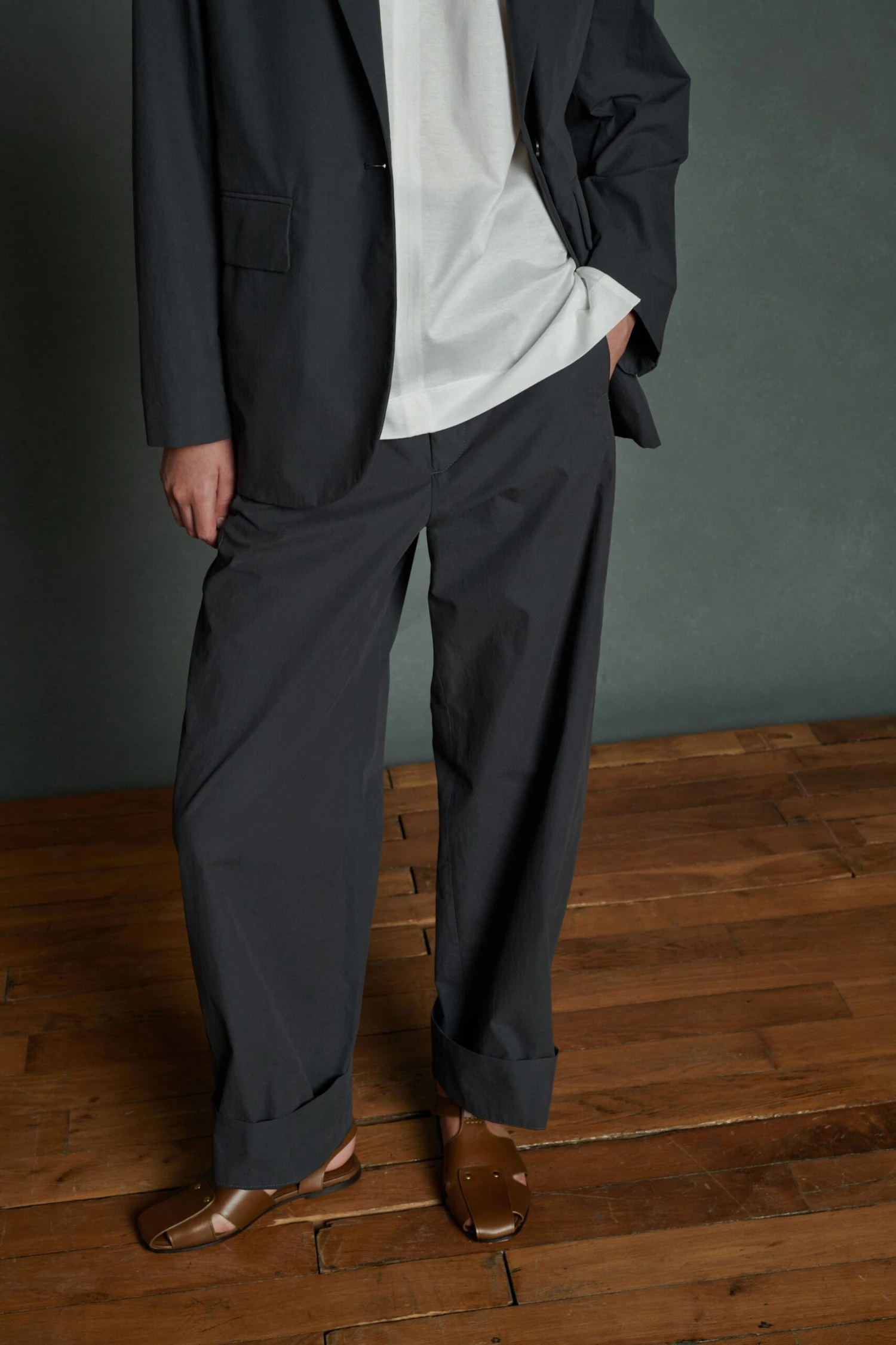 PRESTON est un pantalon en popeline de coton fine et légère. Sa taille haute est ajustable grâce des pattes de resserrage boutonnées. A associer au blazer SEVRES pour un costume d’été.
