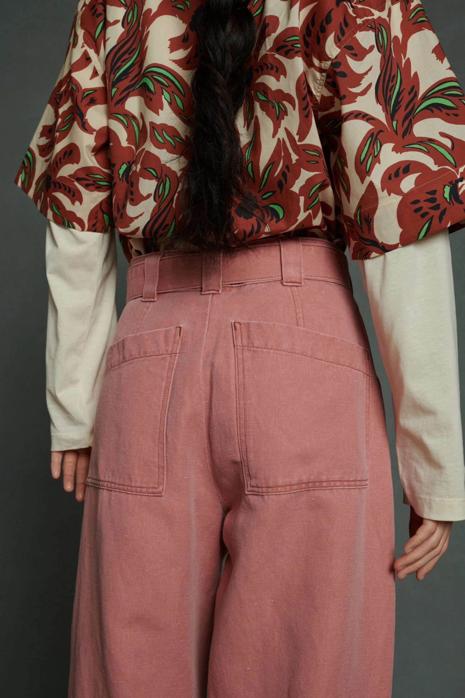 VOLAGE est un pantalon en toile de denim souple. Sa taille haute se resserre grùce à une large ceinture coulissante. Il est reconnaissable par ses poches à la découpe en biais et sa silhouette arrondie. Les jambes sont volontairement longues pour varier les longueurs et pouvoir le porter retroussé.