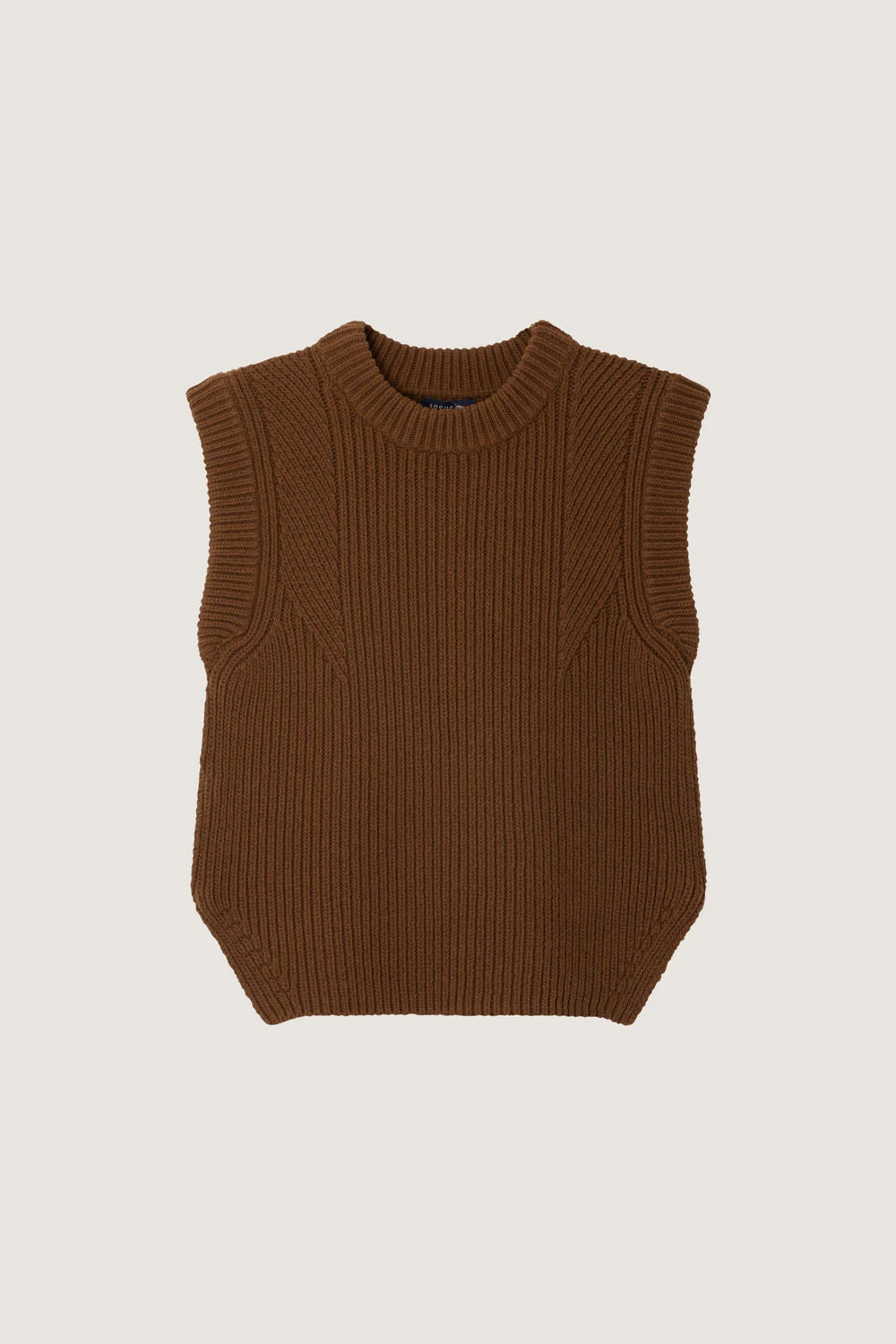 ALKY est un pull sans manches en maille épaisse à porter à même la peau, ou superposé à une chemise, une robe ou un pull fin. Les jeux de diminutions et de côtes en biais apportent relief et fantaisie en donnant l’illusion de fines torsades.