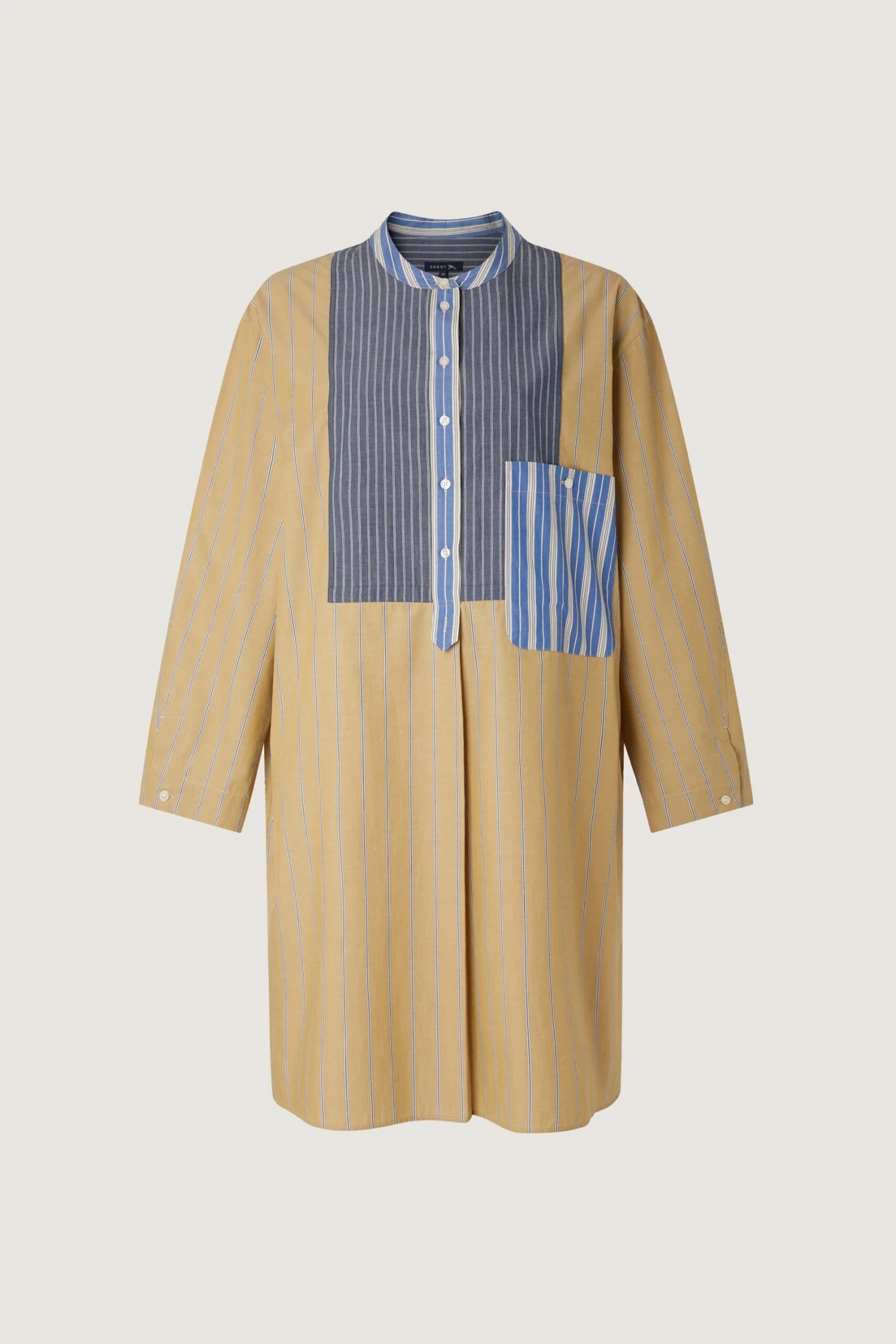 ANNAELLE est une robe liquette constituée d’un patchwork de rayures sur le dos, le plastron, la poche plaquée et la patte de boutonnage. A superposer à un pantalon comme une large chemise, sous un blazer ou une veste, ou à porter en robe courte jambes nues en été.