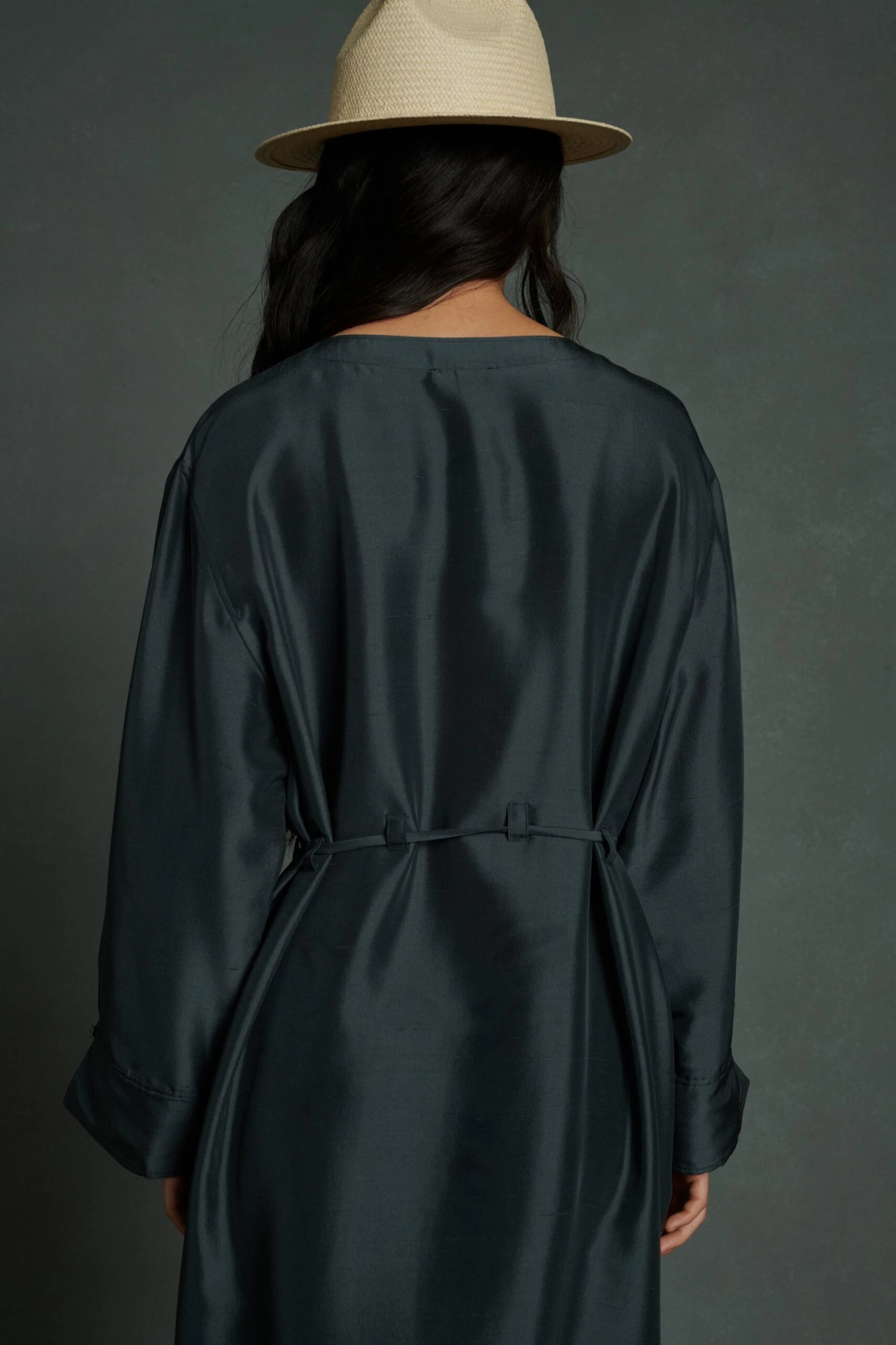 WELL est une robe sophistiquée en soie. Un panneau de tissu crée un effet asymétrique, souligné par une surpiqûre. Le décolleté est modulable grâce au bouton à l’épaule. Le doupion de soie gris ardoise, aux reflets brillants, en fait une option aussi bien adaptée au quotidien que pour une occasion habillée.