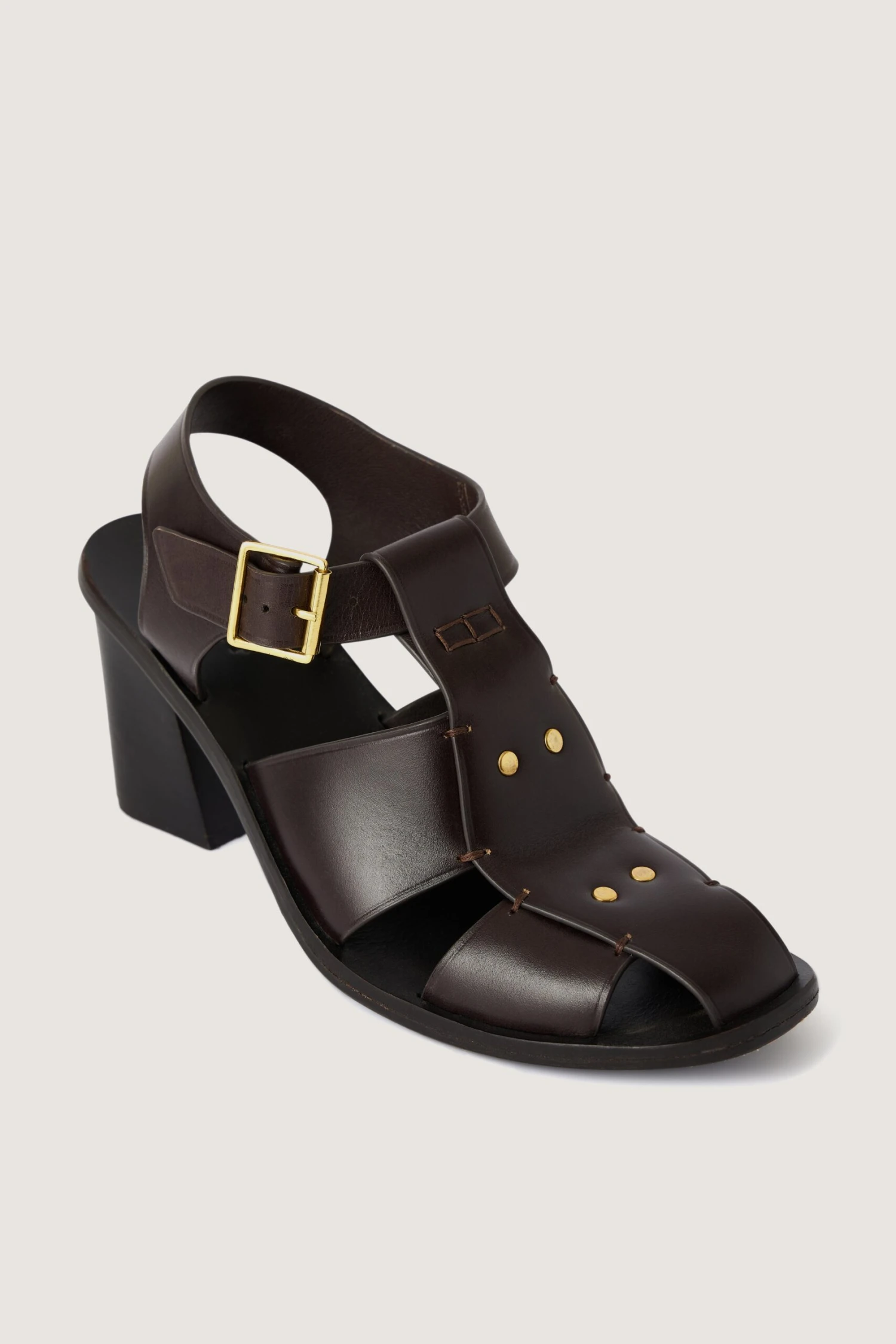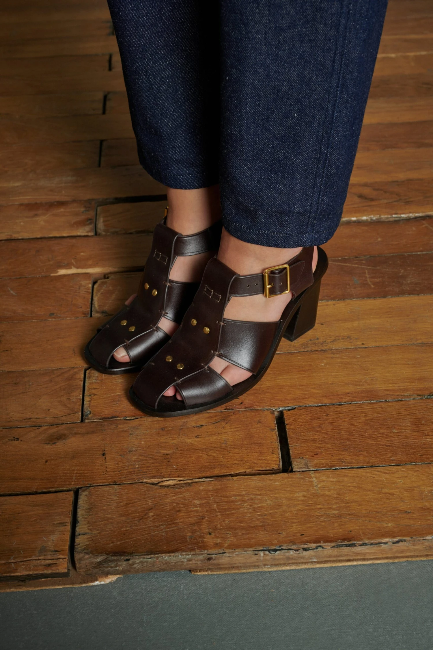 ALES est une paire de sandales à talons en cuir souple. Elle présente une tige effet cage constituée de bandes de cuir tressées. Portées avec une paire de chaussettes épaisses, elles traverseront la mi-saison. Son talon large apporte stabilité et confort.