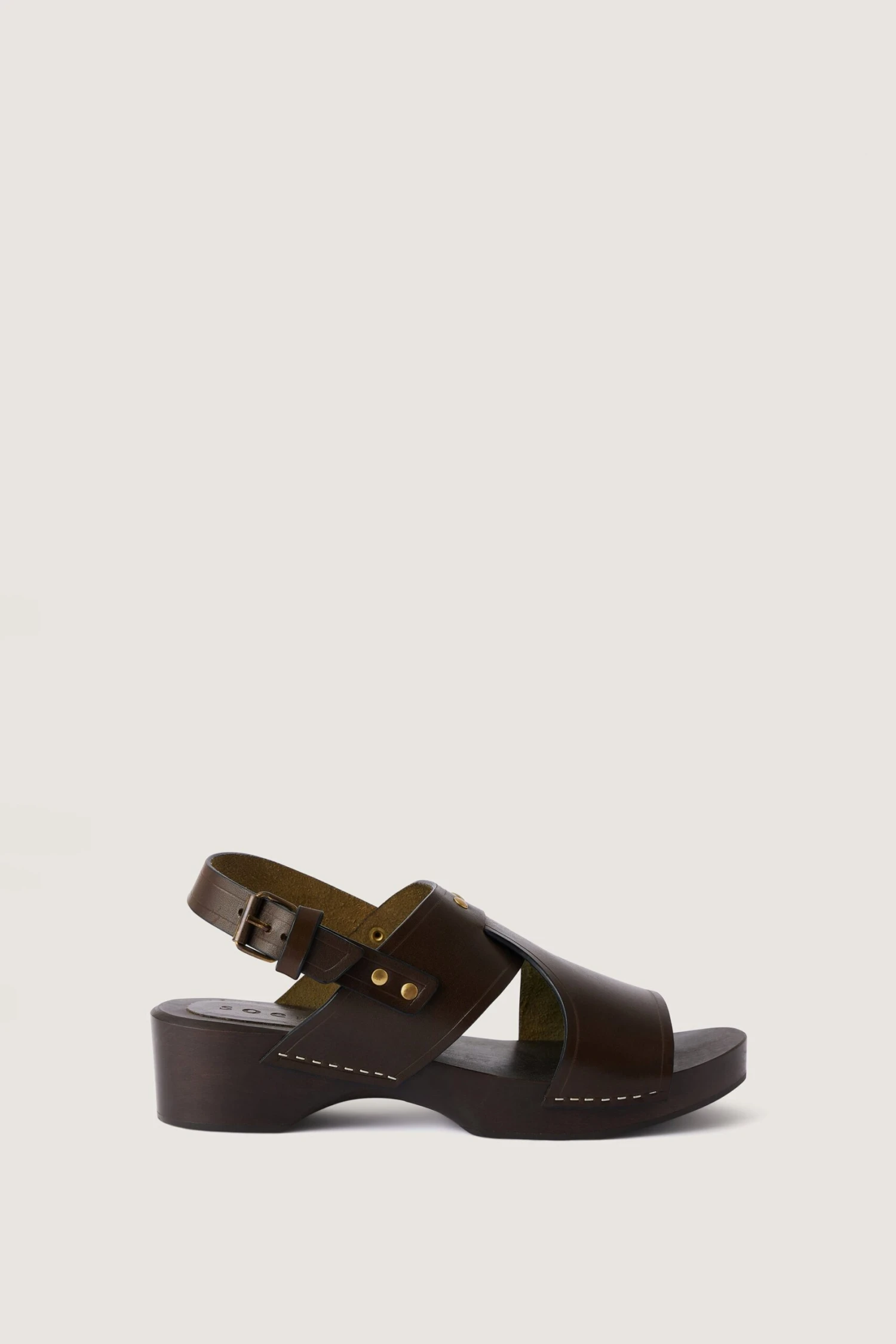 AMY est un sabot compensé. Soeur revisite pour la première fois ce soulier traditionnel en y apportant des détails d’agrafes dorées et de surpiqûres contrastées. La semelle en bois est légère et recouverte d’une fine couche en crêpe permettant d’amortir les chocs. Ultra confortable, elle se portera toute la journée avec aise.