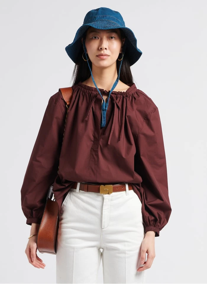 Ce modèle est présenté avec Chapeau Bob en coton et lin by SOEUR, Ceinture en cuir glacé by SOEUR, Jean bootcut en coton by SOEUR, Sandales plates en cuir python by CLARIS VIROT, Sac bandoulière en cuir by SOEUR